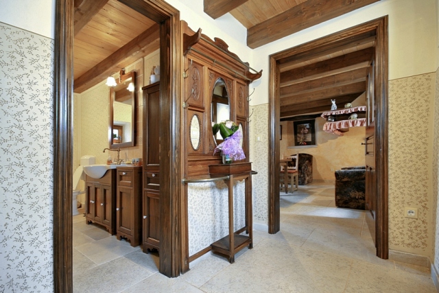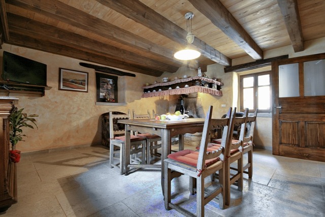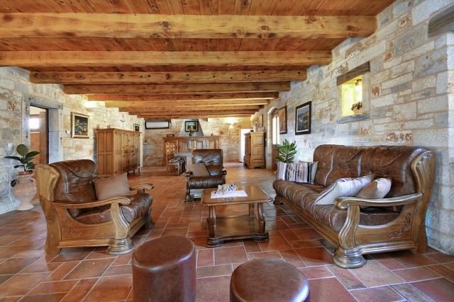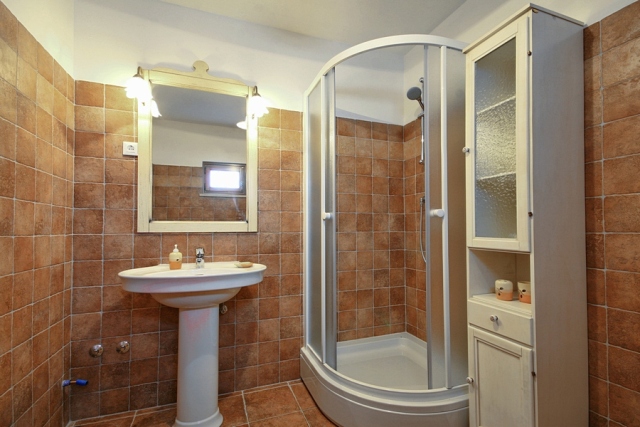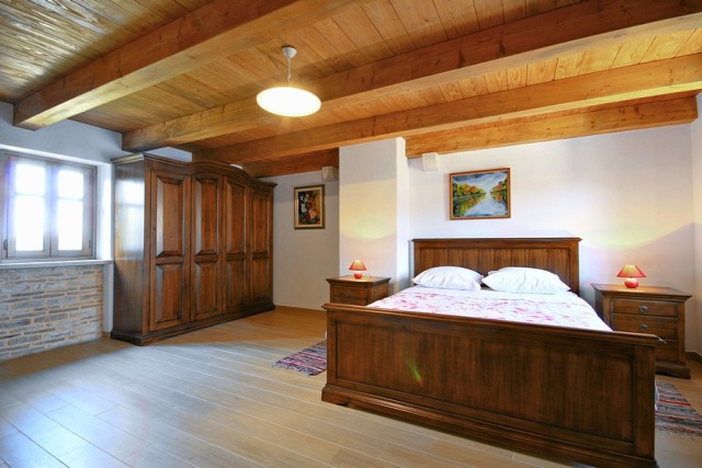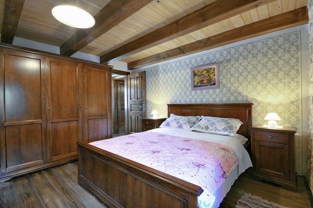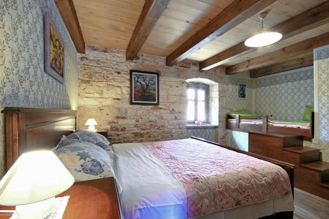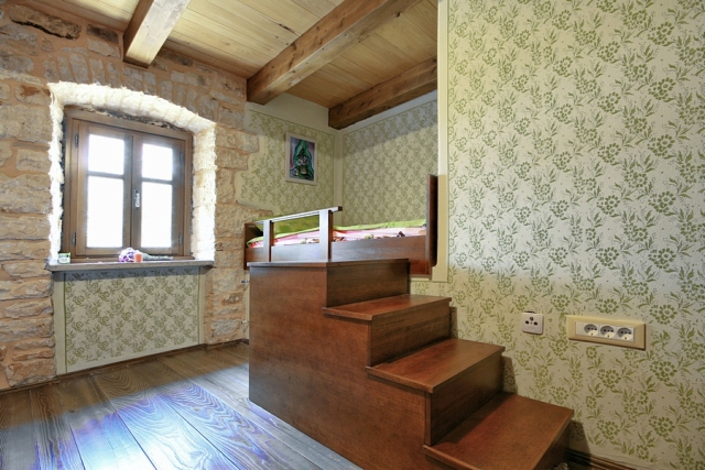 The stone house has 2 floors with total area of 90 m2. It consists of a ground floor where are bathroom and kitchen with dining room, which is decorated with a large open fireplace. On the first floor there are two double bedrooms, one with a child bed.