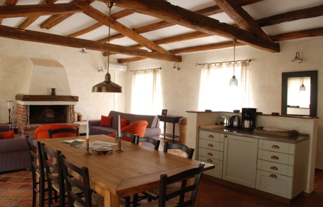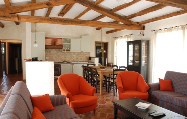The large space includes a fully equipped kitchen, the dining room for eight persons and the living room with a fireplace, and is designed as a functional integrated complex intended for a pleasant abidance of all residents of the villa.