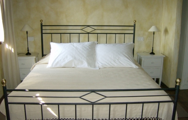 The bedrooms have metal double beds and white wardrobes with vanity tables and a chair. One bedroom on the ground floor has a view to the yard. This room has an integrated bathroom with a shower. The second room has a separate entrance from the covered terrace with a view to the pool and the yard. This room has a bathroom with a shower. The bedrooms on the upper floor have their own bathrooms. One of them has a covered terrace from where the view spreads on the settlement, yard, the pool and grasslands.