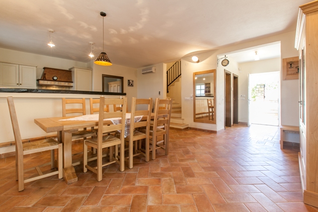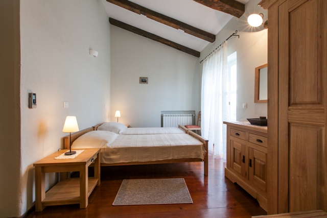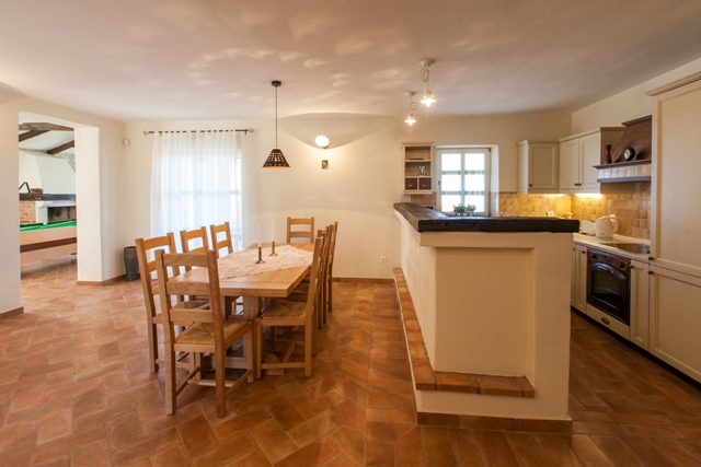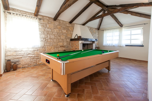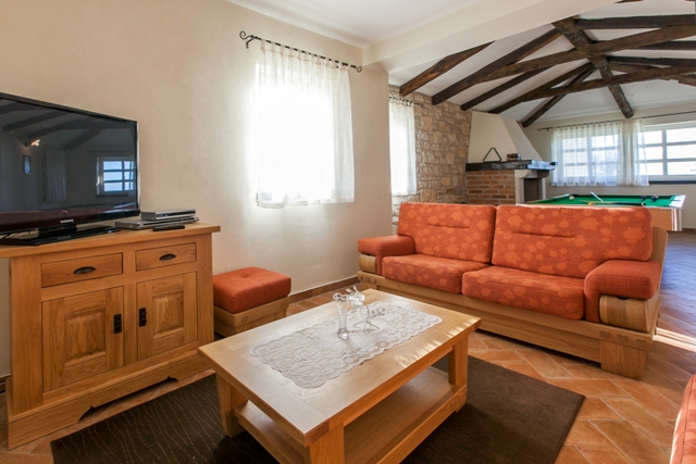 The villa consists of ground floor and upper floor. Villa is equipped with rustic design furniture made of Croatian oak, and the bedrooms are equipped with combination of single and double beds. In the living room is located an open fireplace lined with decorative stone. Fully equipped kitchen and the large open space of dining room is separated by a kitchen bar. Dining room is equipped for eight persons and it has an exit on the covered terrace and view on the yard and pool. Living room with fireplace is integrated with entertainment room.