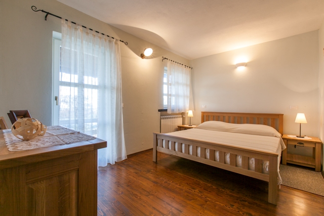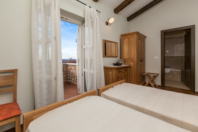 The bedroom on the ground floor has it’s own bathroom with bath tub and exit on the covered terrace. On the upper floor there are three bedrooms with integrated bathrooms. Two rooms have private balcony and a panoramic view on the Adriatic sea.